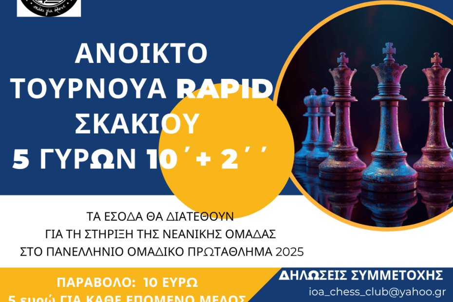 ♟️ 5 γύροι – Ιωάννινα, 20-22 Ιουνίου 2025📍 Εντευκτήριο Συλλόγου Ιωαννιτών Σκακιστών, Αγ. Μαρίνας 58 Η ΤΕΣΣΗΠΙΝ και ο Σύλλογος Ιωαννιτών Σκακιστών προκηρύσσουν το Ατομικό Πρωτάθλημα ΤΕΣΣΗΠΙΝ 2025. 📅 Πρόγραμμα Αγώνων🔸 Παρ 20/6: 1ος γύρος – 17:30🔸 Σαβ 21/6: 2ος γύρος – 10:00 | 3ος – 17:30🔸 Κυρ 22/6: 4ος γύρος – 10:30 | 5ος… Περισσότερα »ΠΡΟΚΗΡΥΞΗ ΑΤΟΜΙΚΟΥ ΠΡΩΤΑΘΛΗΜΑΤΟΣ ΑΝΔΡΩΝ-ΓΥΝΑΙΚΩΝ ΤΕΣΣΗΠΙΝ 2025