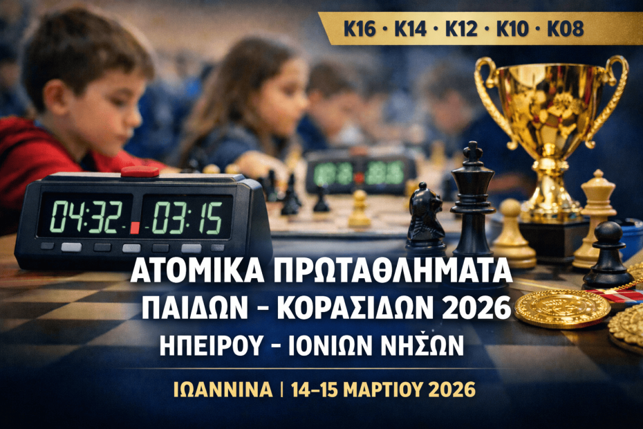 Ο Σύλλογος Ιωαννιτών Σκακιστών και η Τ.Ε.Σ.Σ.ΗΠ.Ι.Ν. προκηρύσσει τα Ατομικά Πρωταθλήματα Παίδων-Κορασίδων 2026 Ηπείρου και Ιονίων Νήσων στις 14 & 15 Μαρτίου, τα οποία θα διεξαχθούν σε 5 κατηγορίες ηλικιών. Ο χώρος των αγώνων θα είναι το 18ο δημοτικό σχολείο Ιωαννίνων στην οδό Πατατούκου 11.Δηλώσεις συμμετοχής έως την Πέμπτη 12 Μαρτίου στη φόρμα: https://forms.gle/orTnmVVuxu3u3xHr8 Η προκήρυξη: