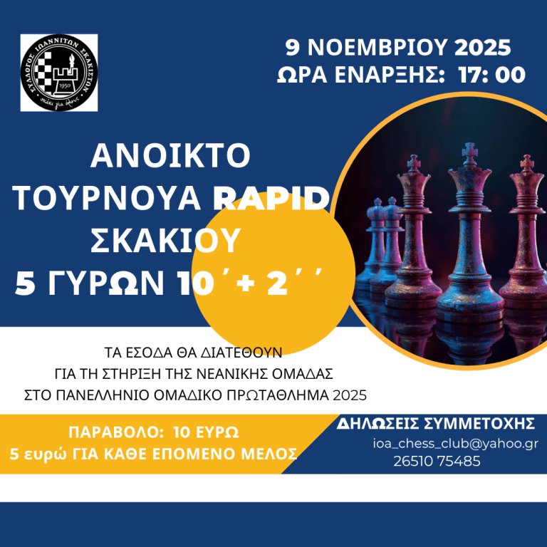 Ο Σύλλογος Ιωαννιτών Σκακιστών διοργανώνει ένα Ανοιχτό Τουρνουά Ράπιντ 5 γύρων (10’ + 2’’), με στόχο την ενίσχυση της νεανικής ομάδας του Συλλόγου που θα εκπροσωπήσει τα Ιωάννινα στο Πανελλήνιο Ομαδικό Παίδων-Κορασίδων στο Αίγιο (27–30 Νοεμβρίου 2025).
